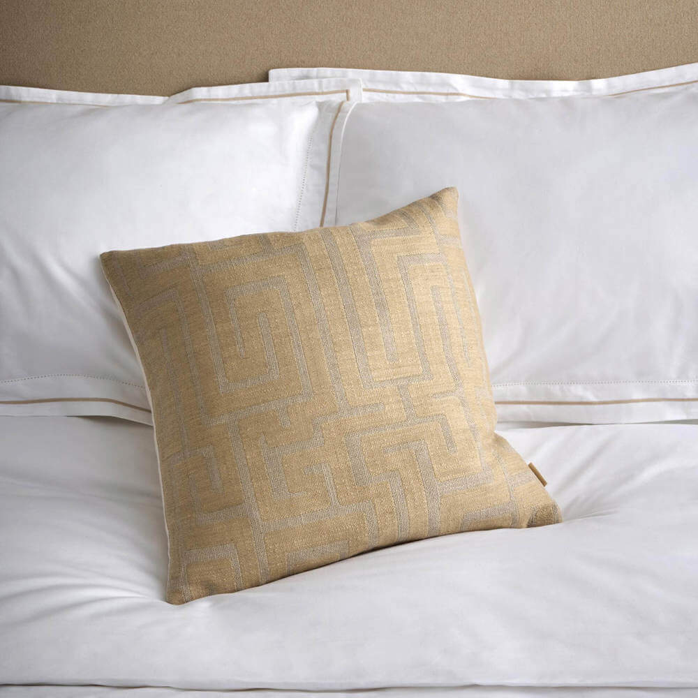 Striking in detail yet effortlessly refined, the Alexandra Cushion pairs contemporary minimalism with quiet luxury. Available in a bold black or a softer tofu shade, each hue highlights the intricacy of its geometric woven jacquard design, bringing graphic interest and tonal sophistication to any setting.