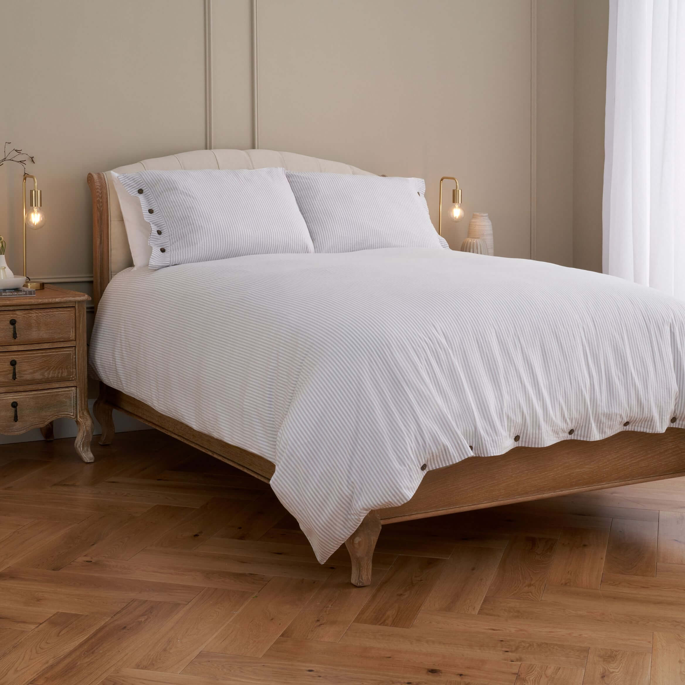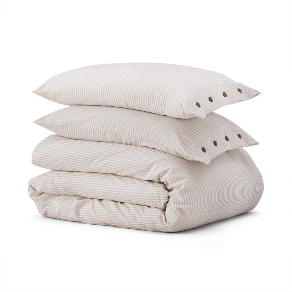 Our 100% Cotton Collection is the perfect choice for laid-back bed linen with plenty of luxury. With a relaxed, rustic fine stripe design and soft natural textures, our breathable cotton is complete with crisp classic edges and genuine water buffalo horn buttons for a sophisticated look.