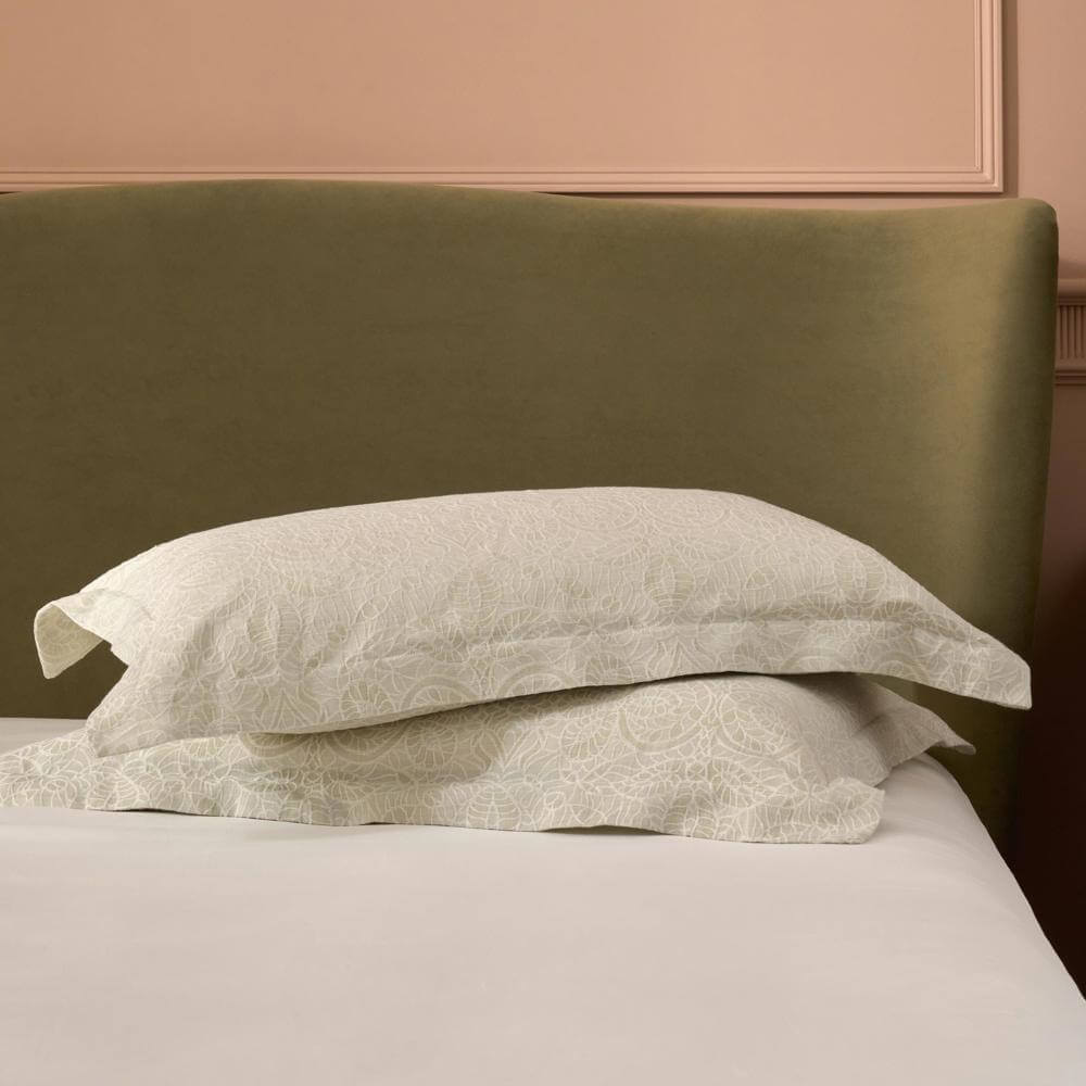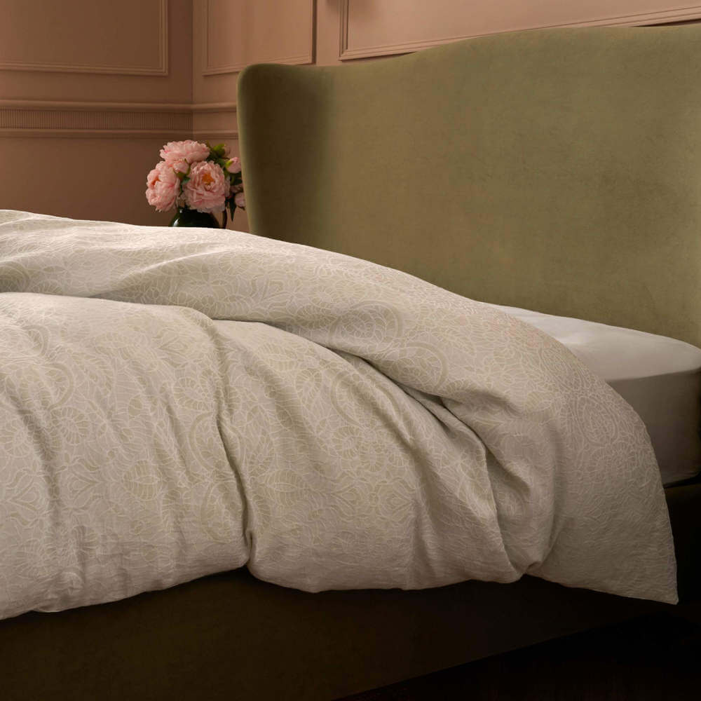 With its delicate all-over floral jacquard pattern and softly textured finish, the Elodie Bed linen set captures the essence of rustic elegance. Expertly woven in Portugal from a sumptuously soft cotton linen blend, it offers breathable comfort with a subtly unstructured charm. The natural tone brings warmth to your décor, while pearlescent corozo buttons add an exquisite organic accent.