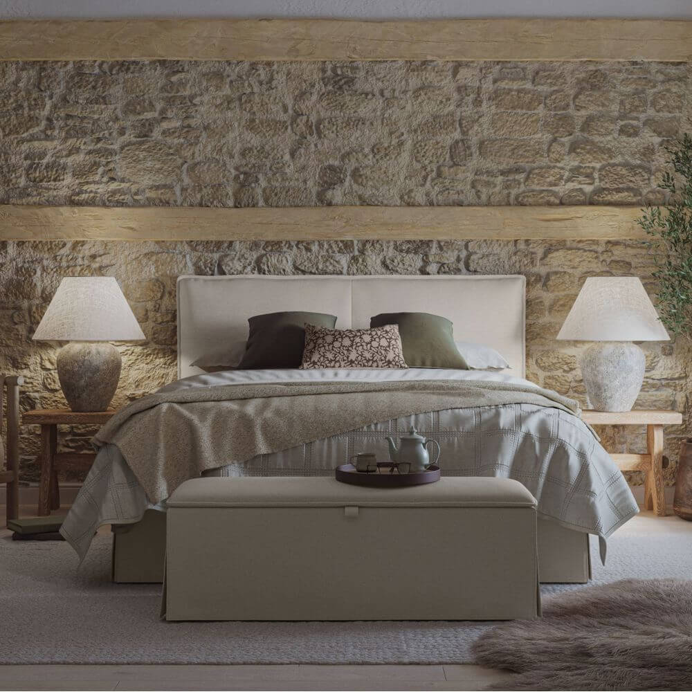 Both pieces showcase elegant and understated design, with a traditional valance skirt, classic French seams and plush, linen-look upholstery in a sophisticated natural-tone finish. The perfect set to create a calm and clutter-free bedroom sanctuary.