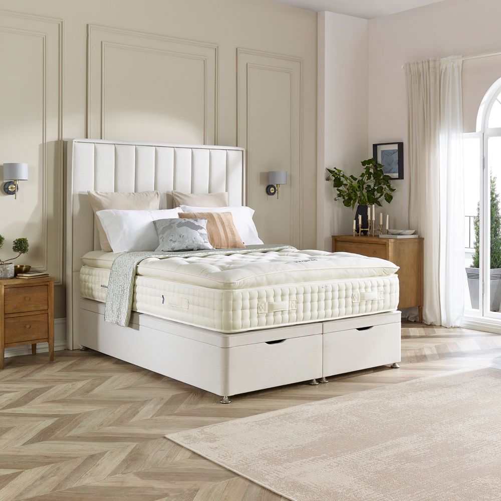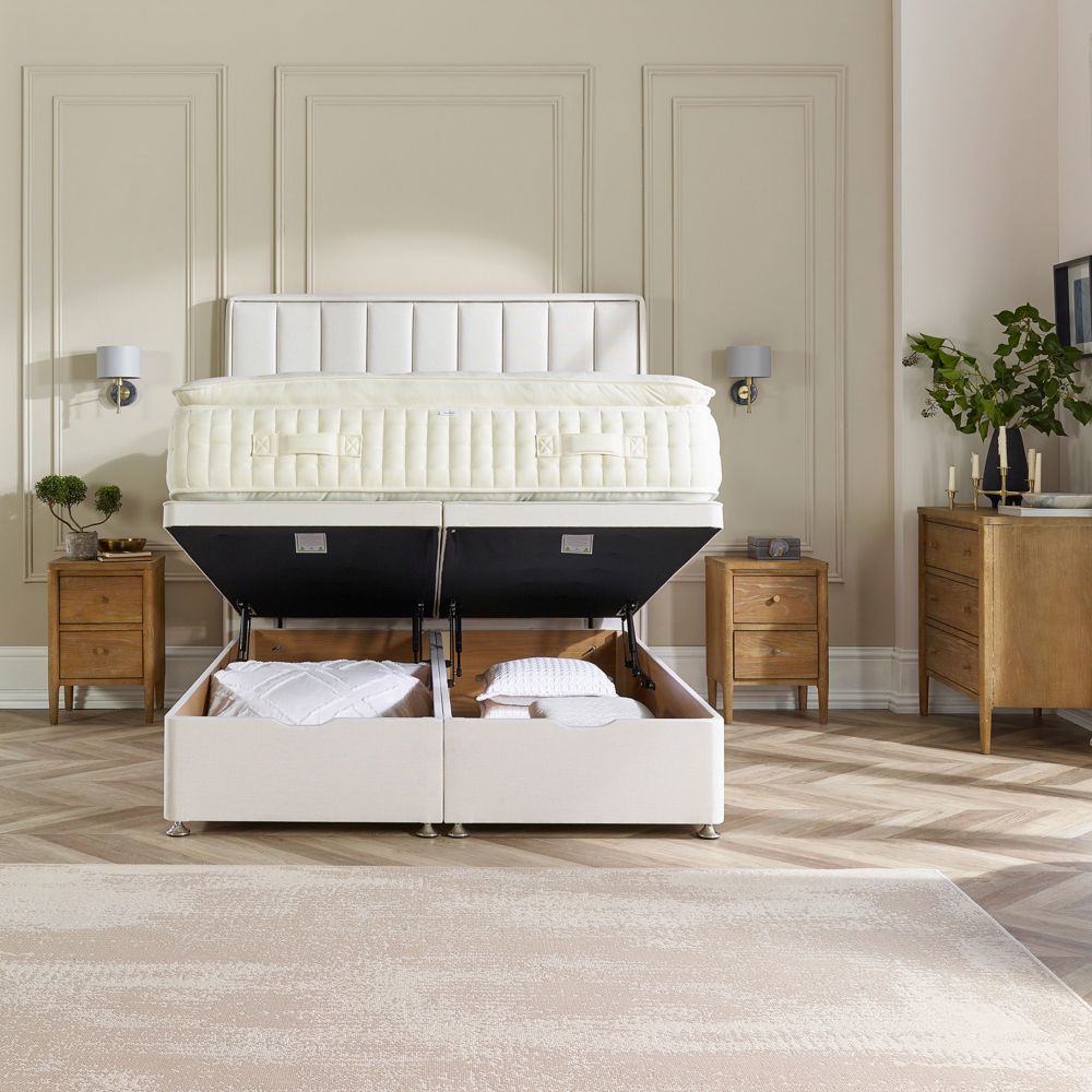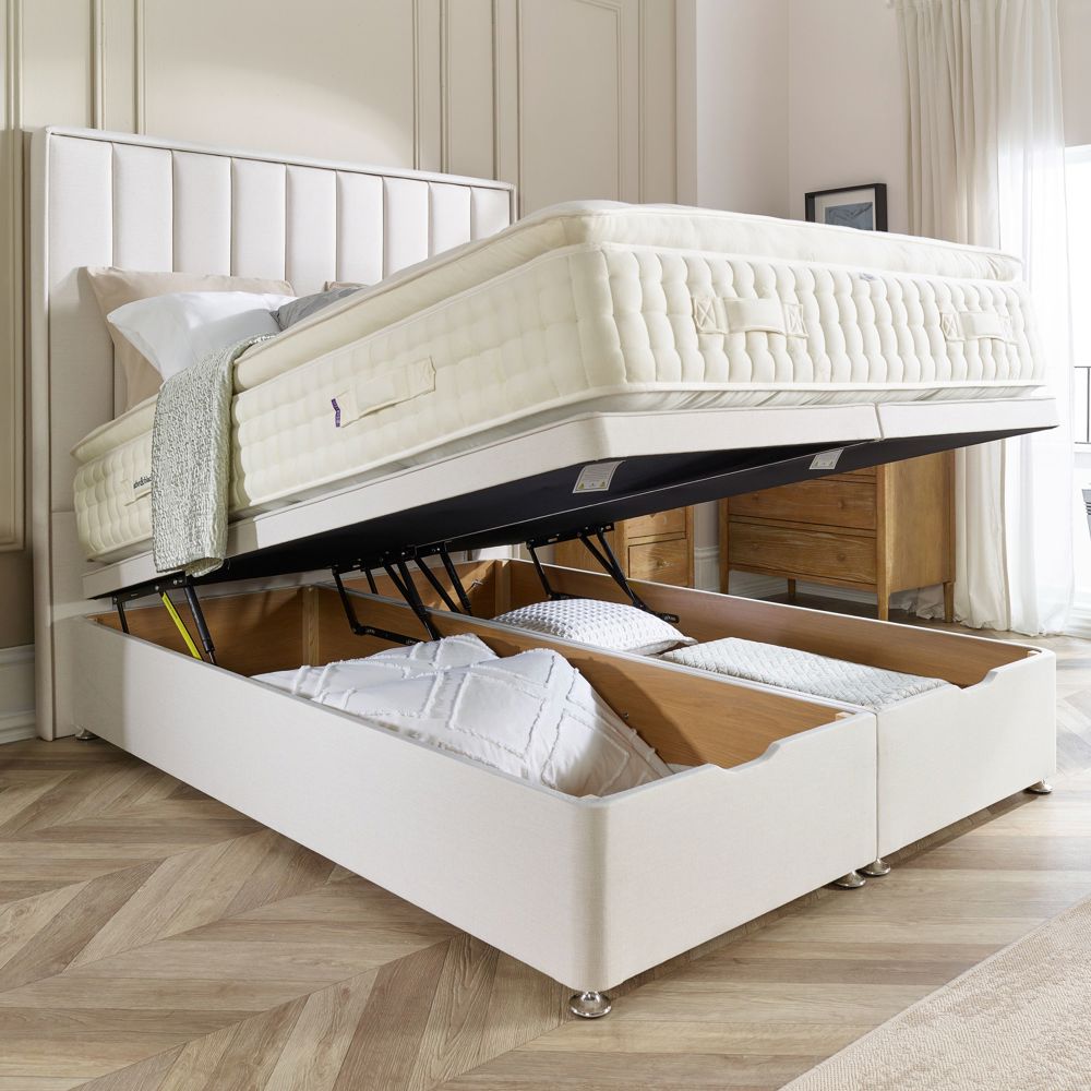 - A traditional divan base, with a front-opening ottoman for all your storage needs