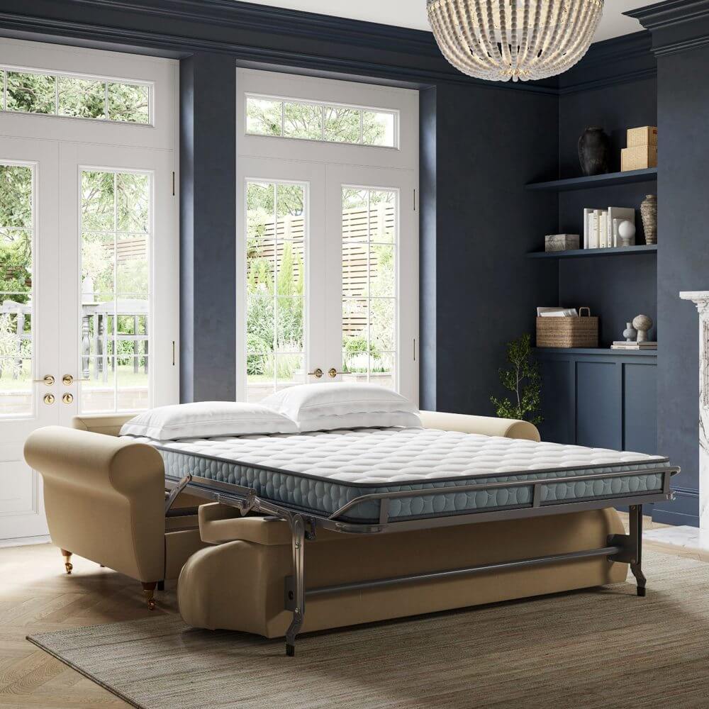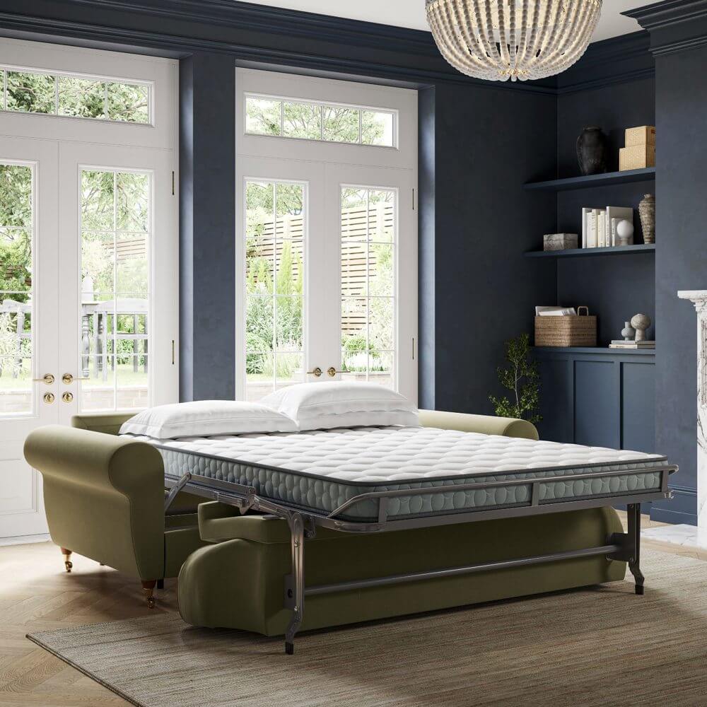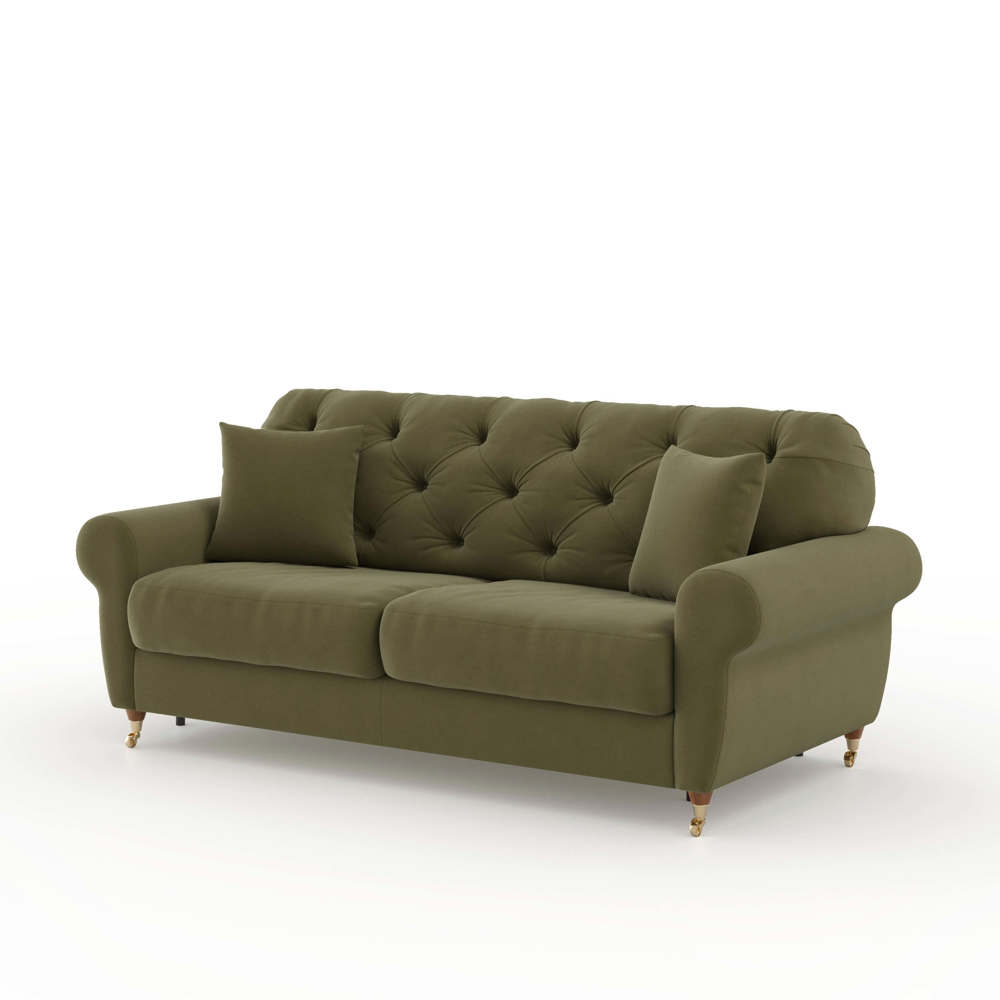 Exquisite Chesterfield styling adorns both the front and reverse of the backrest, allowing the Felicia Sofa Bed to take pride of place in any setting. Every stitch, seam and sculpted curve reflects impeccable Italian craftsmanship, from the deep buttoning to the advanced engineering of the roll-out mattress within.