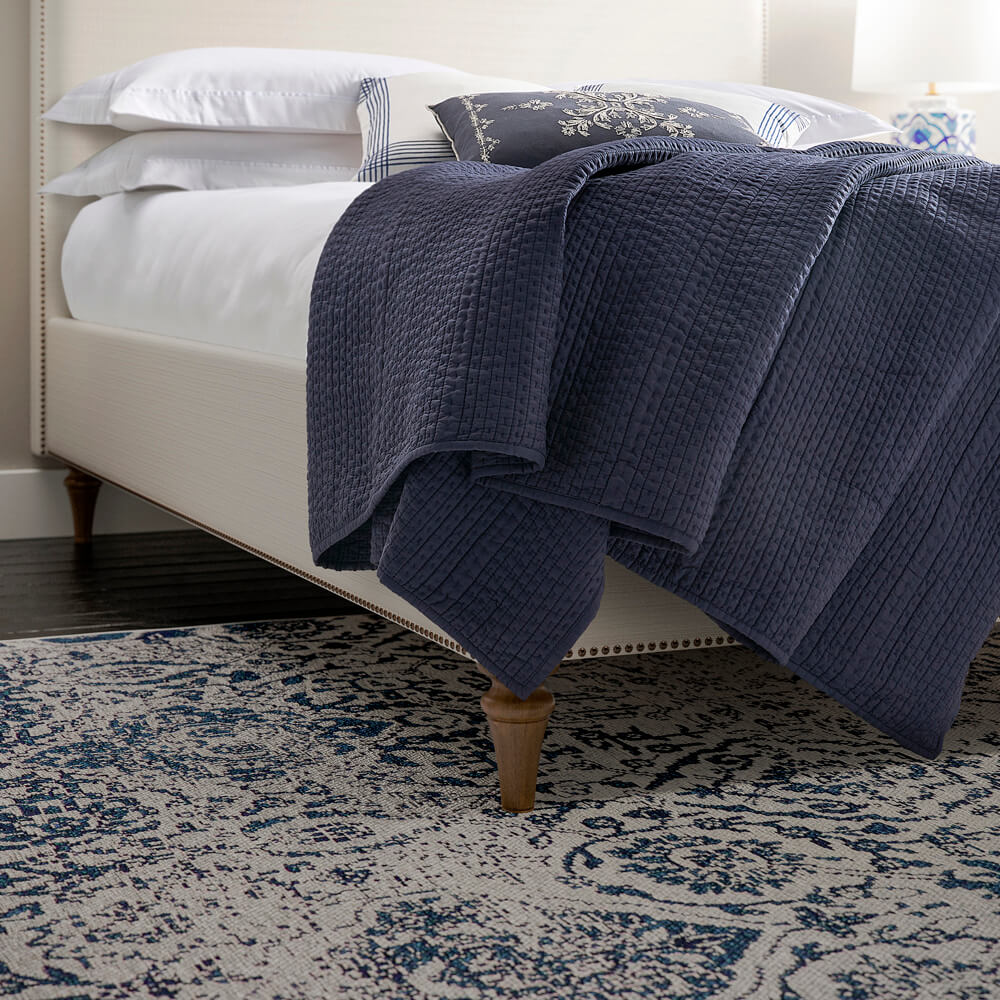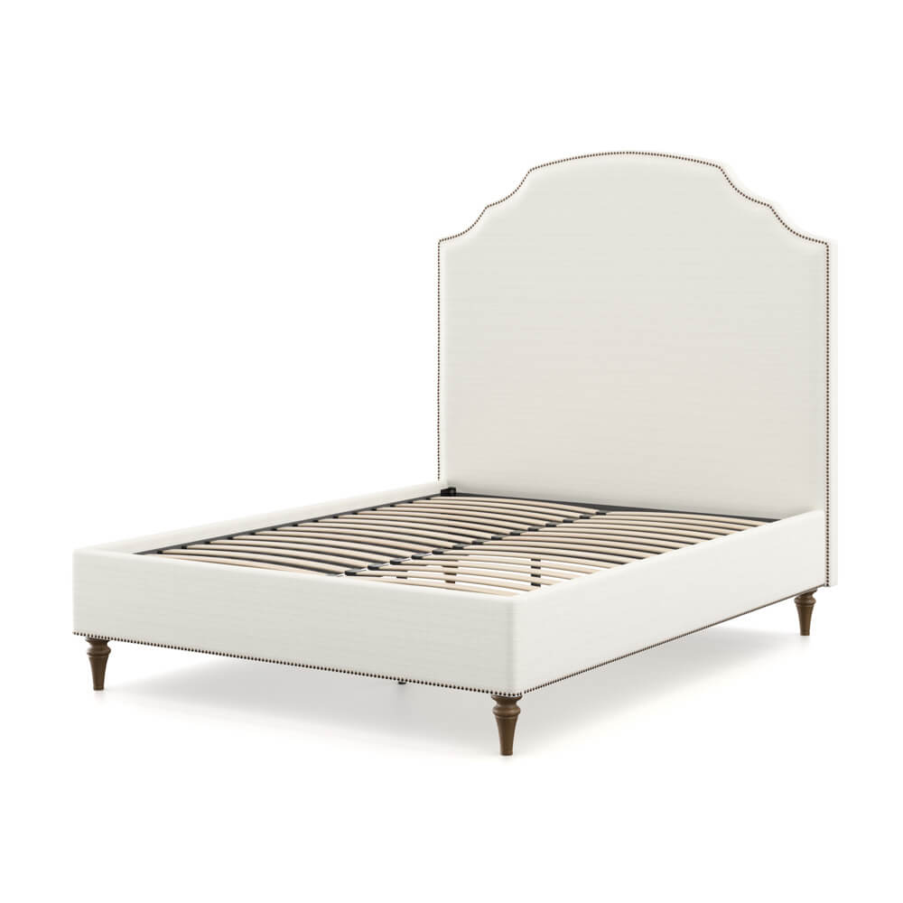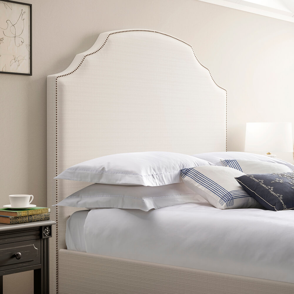 Give your bedroom the royal treatment with our striking Regency Bed Frame. Regency pairs luxuriously light textured fabric and brass studs, set against a dramatic high headboard with subtle scallop shaping. Regency is best paired with a tactile bedscape and lots of natural lighting, making her the perfect centrepiece for a tasteful bedroom.