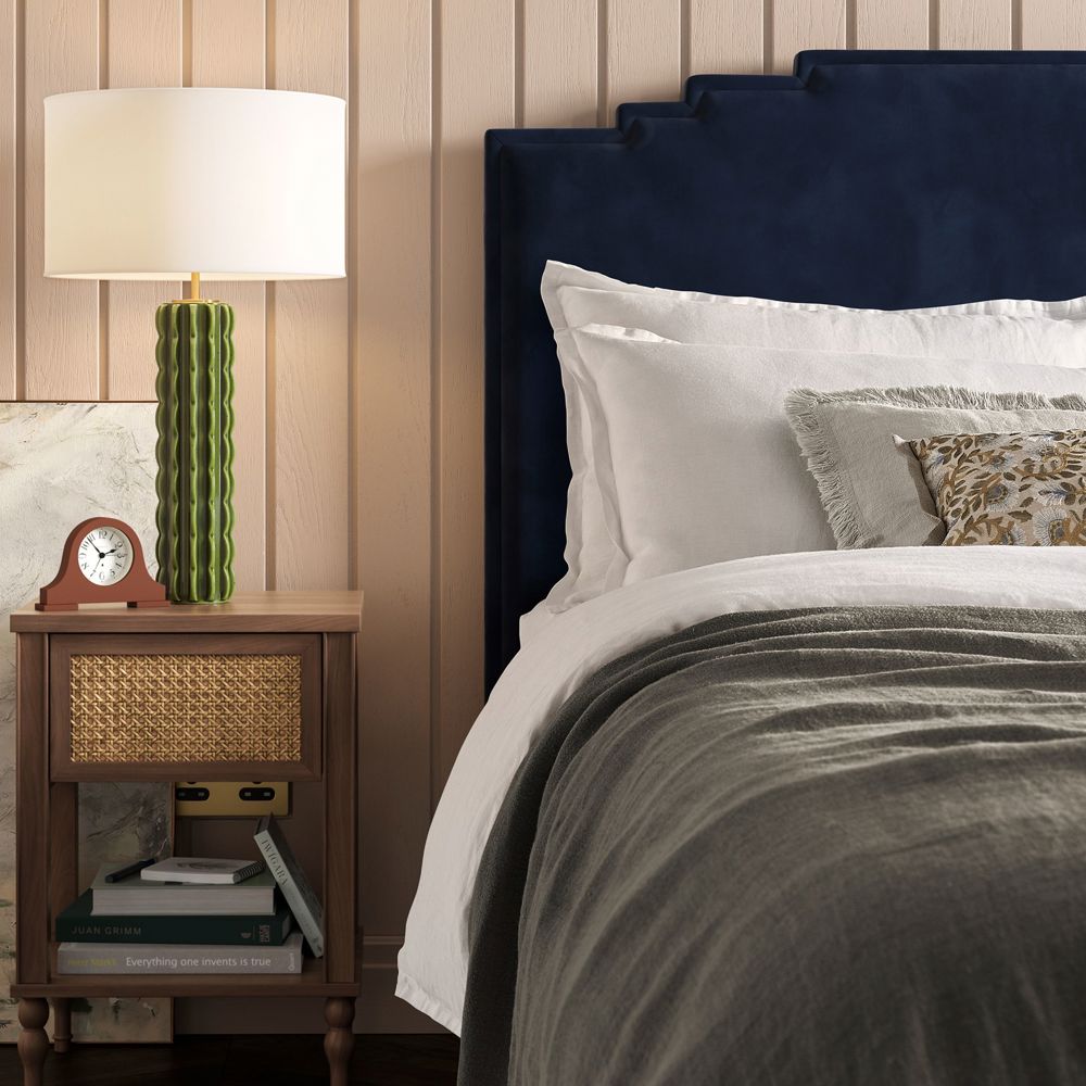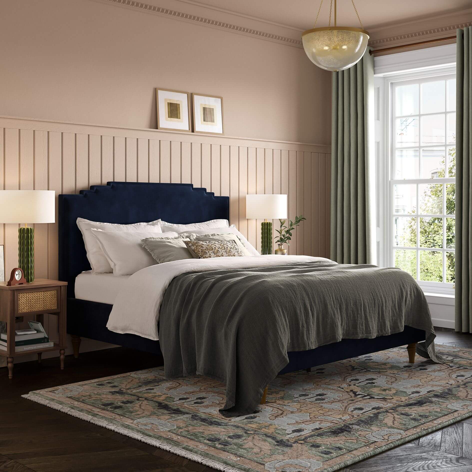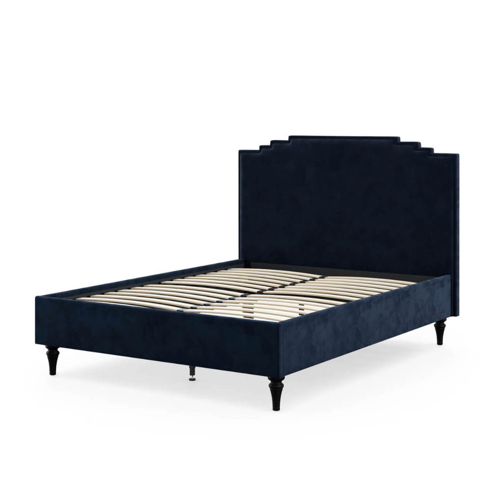 - High, distinctive headboard with Art Deco inspired detail