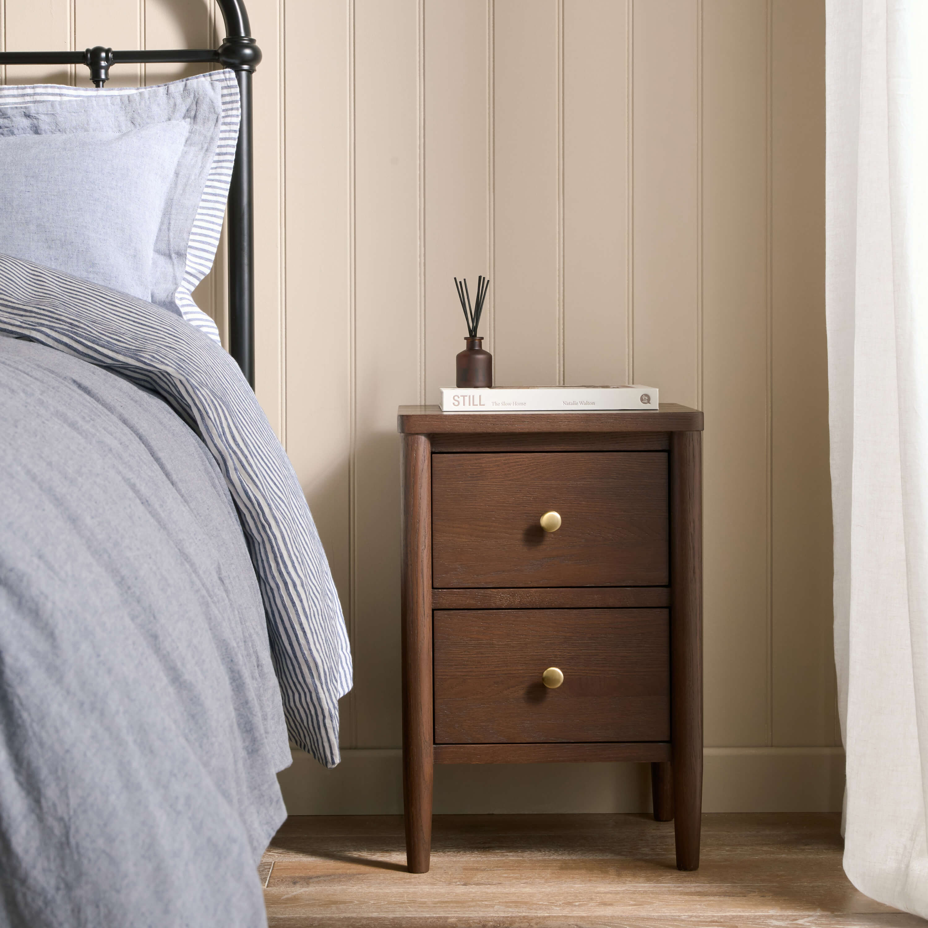 Crafted from weathered oak, the Adina Two Drawer Bedside has a narrow profile making it perfect for smaller bedrooms or apartments. Its solid, practical design allows plenty of room for two good sized drawers with metal handles. Softened by smooth rounded corners and complimented by gently curved peg legs, this bedside is the perfect bedside companion.