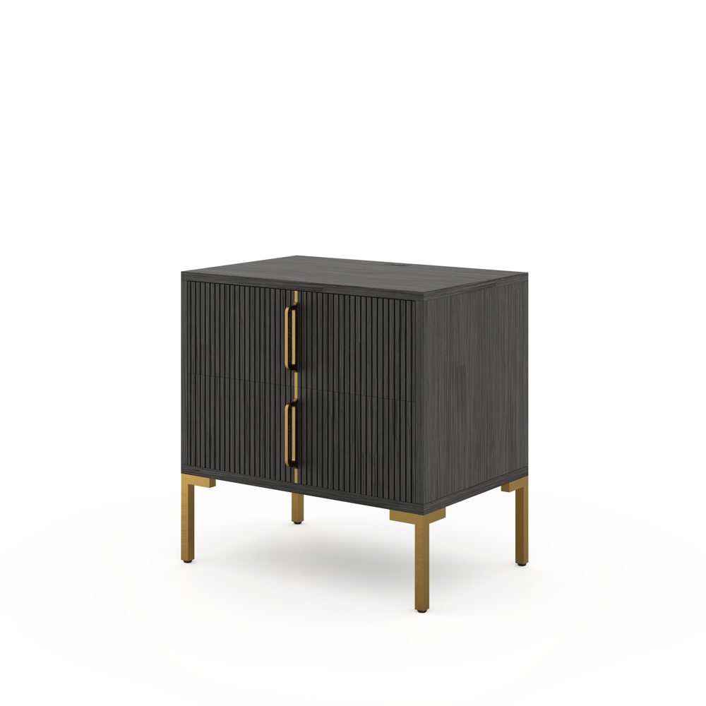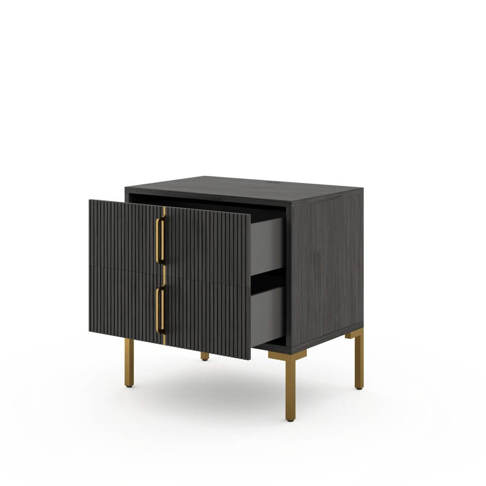 Crafted to sit alongside the Camber Bed, or to complement our exquisite collection of upholstered beds, the Camber Bedside Chest blends contemporary sophistication with luxurious opulence. The ribbed charcoal wood finish is accented by gold-tone vertical handles and angular feet. The design draws inspiration from architectural mid-century modern and the simplistic beauty of Japandi style.