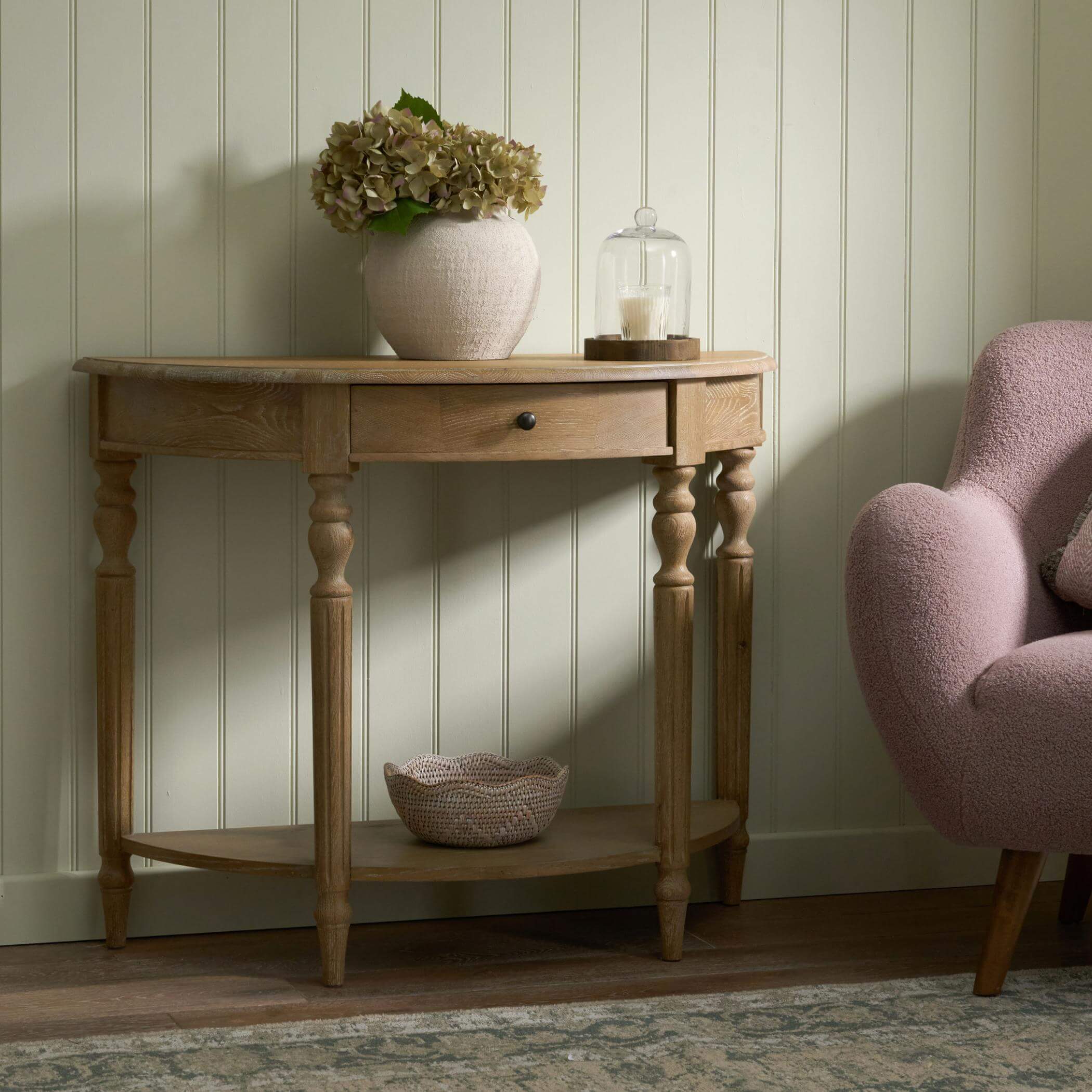 Add softness to your space with the gentle curve of this characterful half-moon table. Crafted from solid, sustainably sourced oak, the Lyon Console Table features ornate carving detail throughout for a timeless feminine look. Its discreet drawer offers useful storage, as well as a half-moon shelf for any extras.