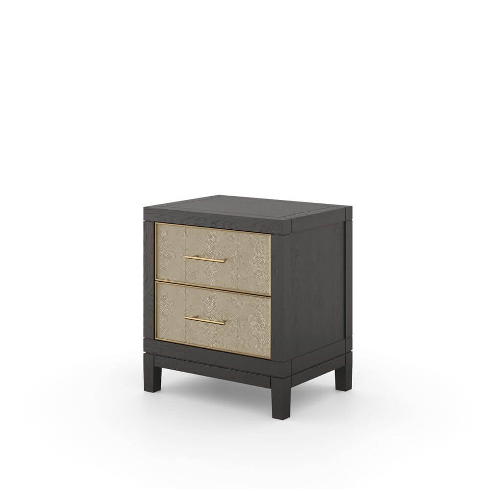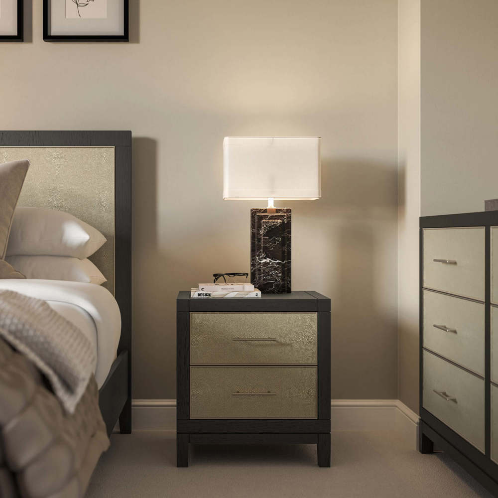 The opulent look of shagreen, reimagined in a stunning bedside companion. Introducing the Rae bedside chest, giving you the best of style and storage. With two spacious drawers and exquisite brass handles and trim, the Rae bedside chest beautifully layers textures and tones to create a sophisticated look.