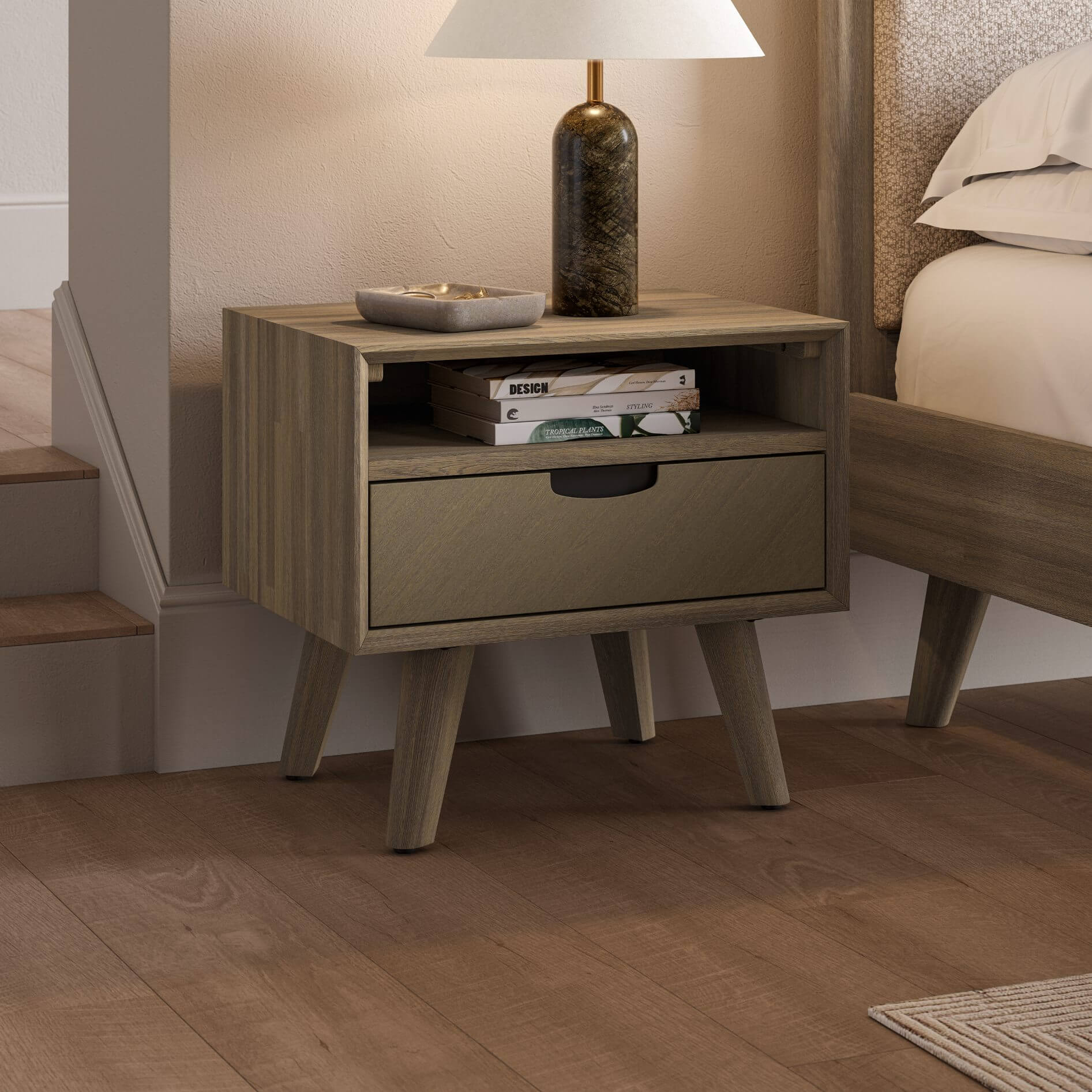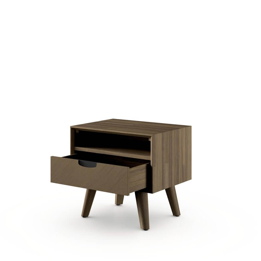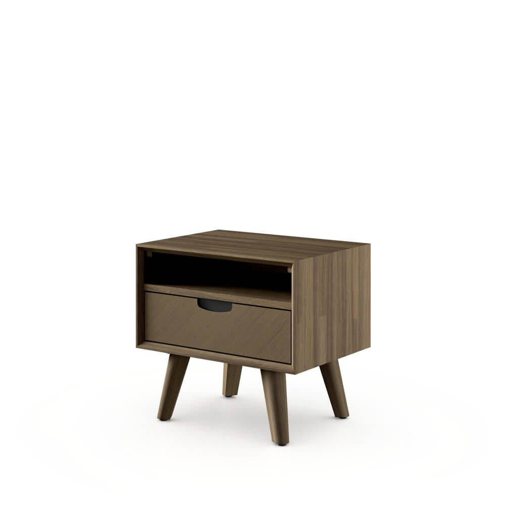The single soft-close, felt-lined drawer is adorned with unique diagonal wood panelling and a subtle cut-out handle. An open shelf provides the perfect spot for displaying beloved books or trinkets.