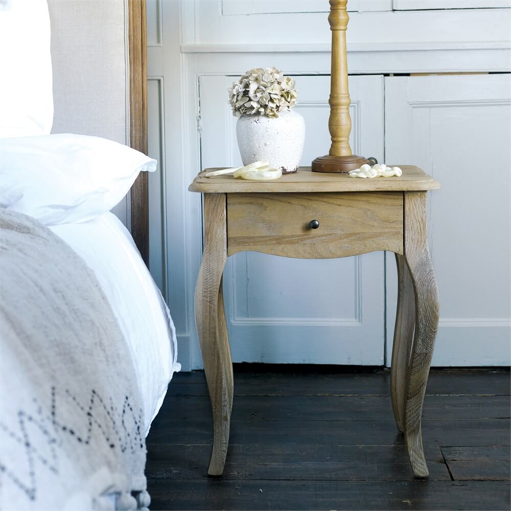 Part of our Sienna luxury bedroom furniture collection is this beautifully crafted French-inspired bedside table. Made from solid weathered oak, it’s stunning finish is unique featuring a charming single drawer with metal handle, dovetailed joinery and sweeping curves. There’s no better place to rest your morning or bedtime cup of tea.