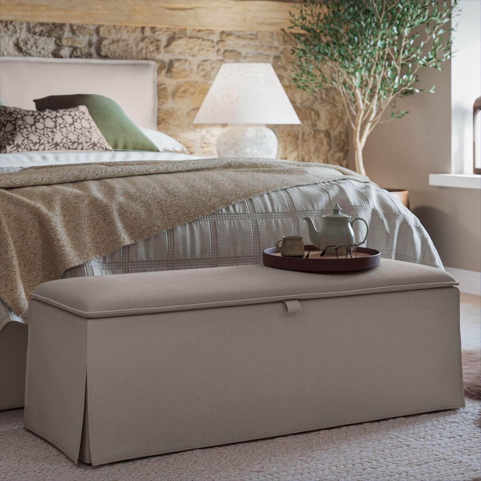 • Fully upholstered in soft, linen-look fabric in a natural tone