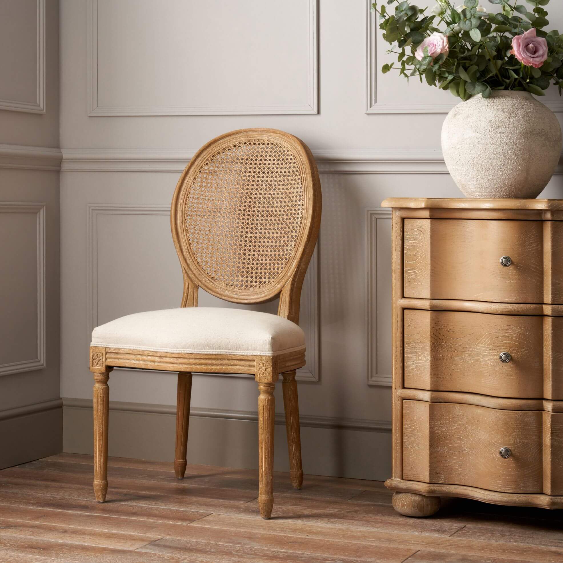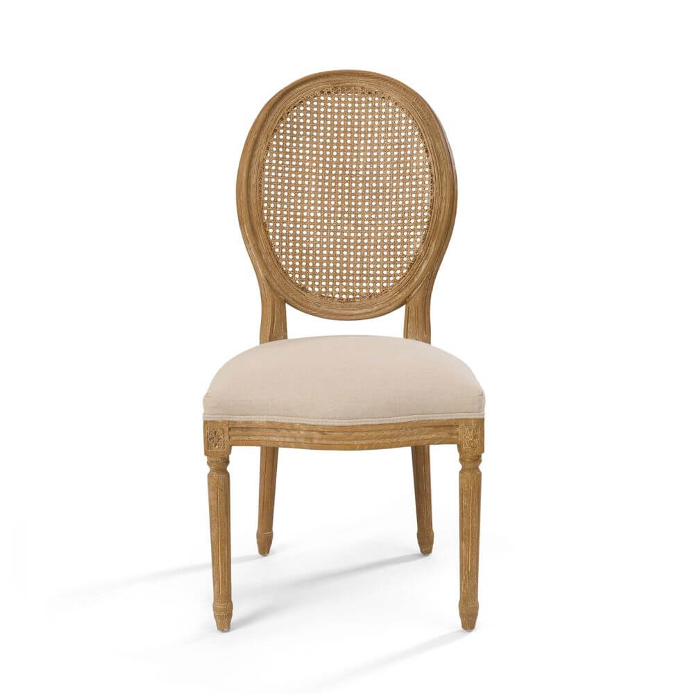 The Sienna Rattan Back Chair is a versatile and charming edition to our classic Sienna range. Featuring a backing of statement rattan in a timeless oval shape, sink into comforting curves and intricately crafted details. Designed to sit perfectly alongside the Sienna Dressing Table or Desk, the seating area is wonderfully plush with 100% natural linen upholstery.