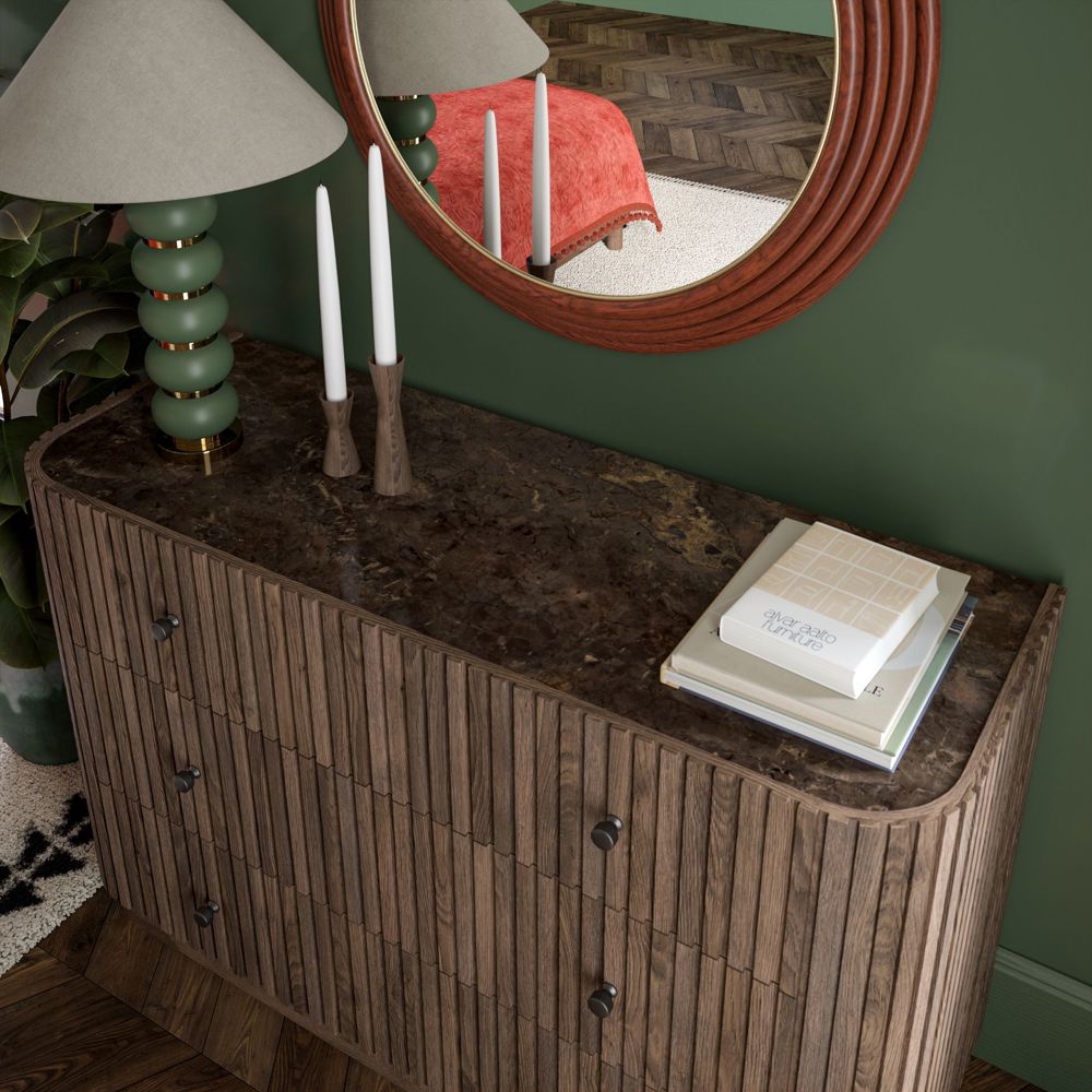 The solid marble surface creates a dramatic backdrop for your most-loved trinkets and treasures, whilst three soft-close drawers offer ample storage, complete with weathered antique metal handles. The curved profile adds an indulgent dose of softness to your home, with a stylish slatted design that exudes opulence.