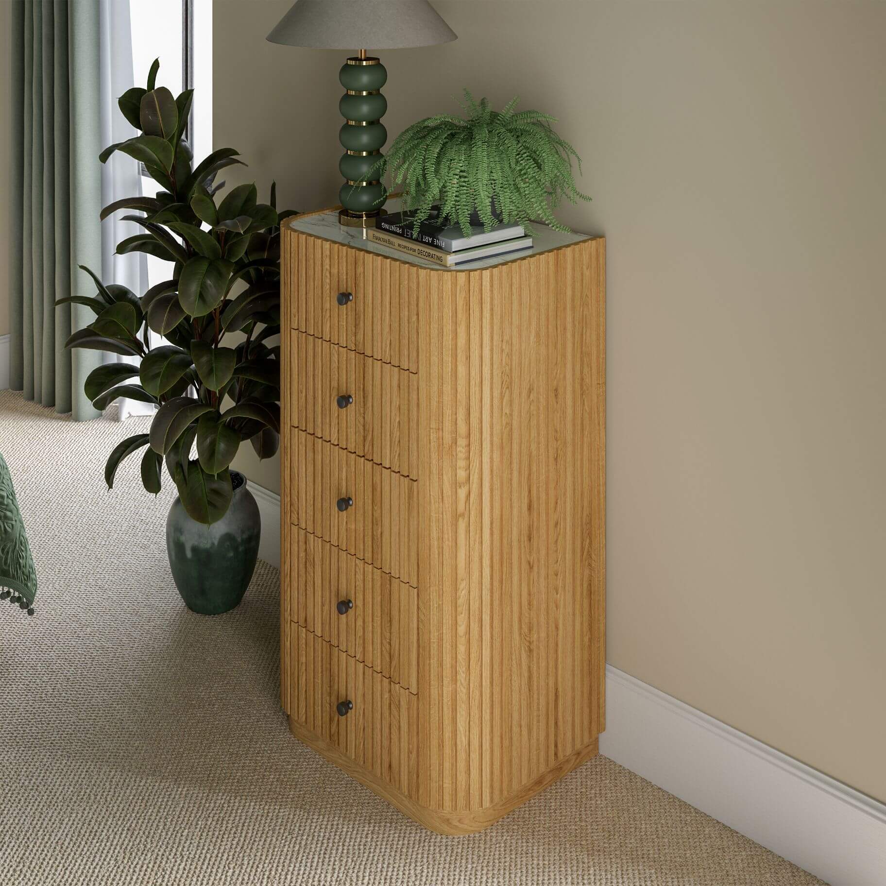 For all of life’s little luxuries, the Jacob Tallboy offers elegance and practicality in abundance. Pair with the stunning Jacob Bed or introduce as a stand-alone piece, with its striking slatted design and statement solid marble surface. Five spacious soft-close drawers keep everything you need close at hand, in your choice of a neutral light or dramatic dark stain finish, plus weathered antique metal handles.
