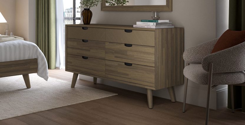 All the influences of minimalist mid-century design, infused with a warm and cosy aesthetic. The Saunders Chest of Drawers is a stunning piece that serves beautifully as a bedroom storage solution or a contemporary sideboard in any living space. The lightly distressed Acacia wood finish is exquisitely showcased in the clean lines, neat silhouette and striking panelling that adorns each of the six generously sized drawers.