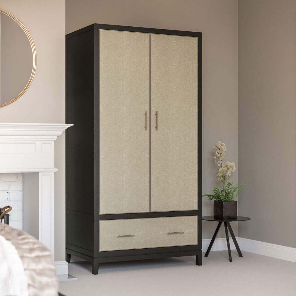 Bring the lustrous beauty of our Rae collection to your home with this exquisite wardrobe. Exuding all the opulence of 1920s shagreen, our expertly crafted resin is paired with monochrome wood for a softer take on monochrome. The Rae wardrobe is complete with brass handles and trim on the double doors and single soft-close drawer. Inside, a full height hanging rail keeps your treasured garments safely stored.