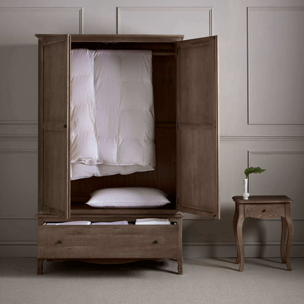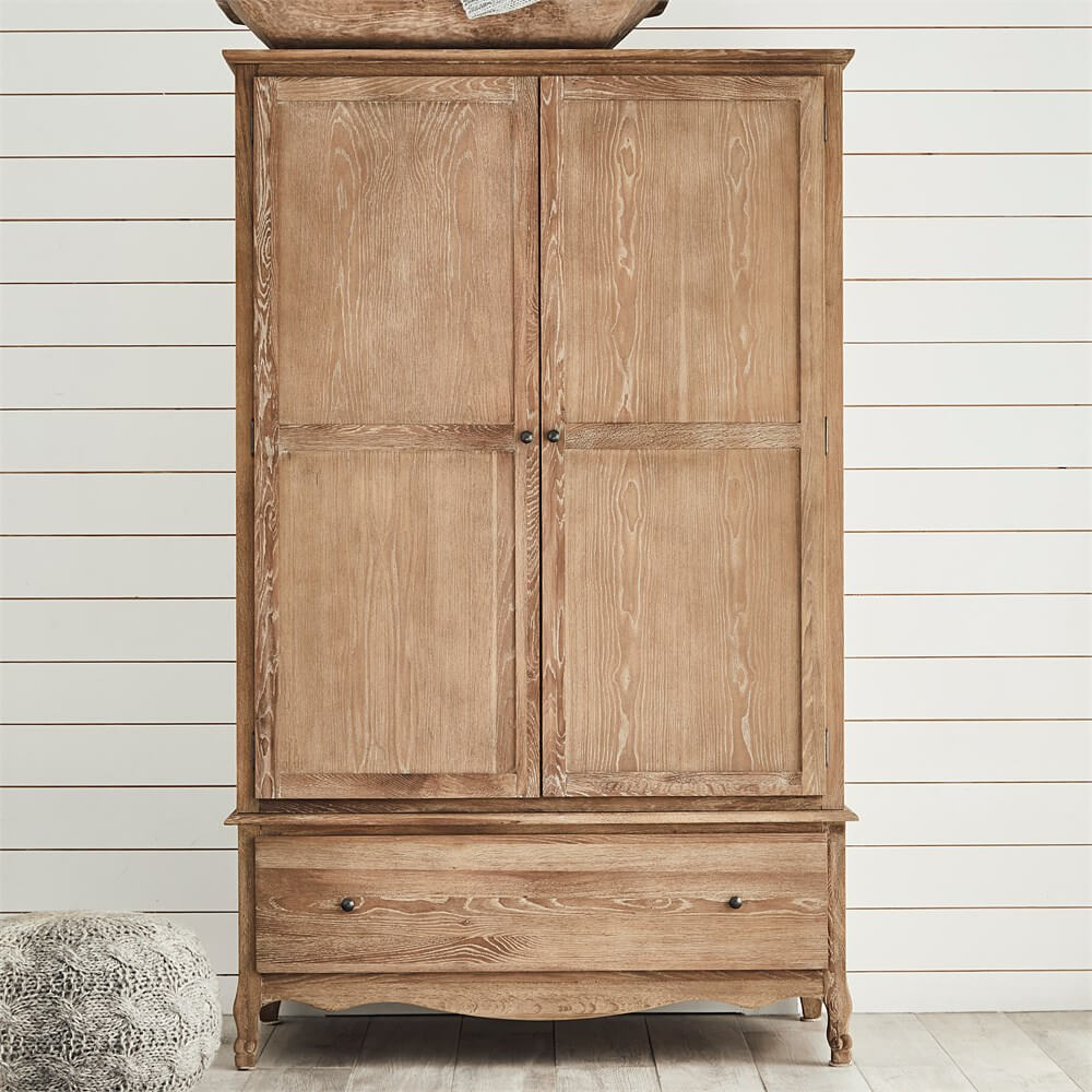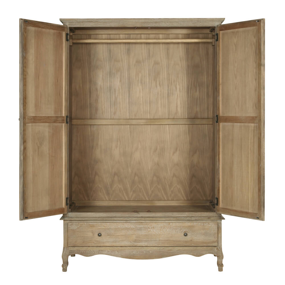 This French-inspired wardrobe offers wonderfully generous storage and is designed to be strong and sturdy. Crafted from weathered oak with cabriole legs, this beautiful wardrobe comes complete with a large hanging rail and a deep drawer with dovetailed joinery.