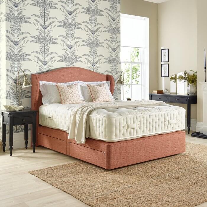 Our carefully curated collection of pink upholstered divan beds and stunning coordinating pink headboards are handcrafted by artisan bedmakers, Harrison Spinks, in the exquisite shade of Seven Blossom – a pale, peachy hue inspired by the beauty of blossom trees in the Spring. Available in Classic, Classic Shallow and Classic Ottoman designs, the traditional-style beds are characterised by their deep sides, which encompass a layer of sumptuous padding and built-in springs for a luxuriously cushioned feeling night after night.