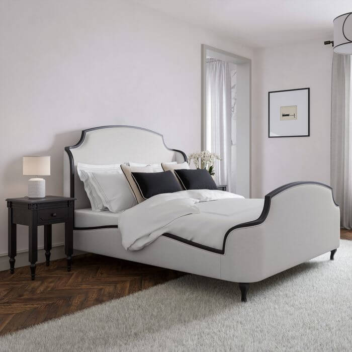 A monochrome master bedroom beckons for a statement bed, a focal point that commands attention and elevates the space with its striking presence. Feather & Black’s Evangeline Bed epitomises elegance, marrying a smooth, natural linen headboard with a modern matte black wood surround in sharp yet harmonious contrast. The symphony of black-and-white is both refined and inviting, sculpting a sanctuary of tranquility and style.