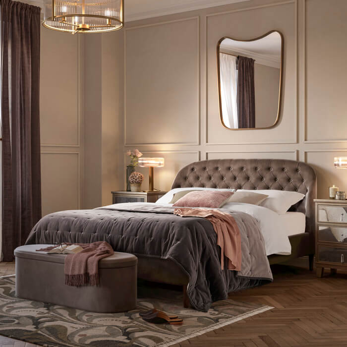 Whether used as the main colour scheme or as accents alongside bolder hues, earthy neutrals infuse your master bedroom with a sense of understated luxury. The sumptuous, chocolate-coloured velvet adorning the deep-buttoned headboard of our Marlborough Bed serves as the perfect statement piece, beautifully offsetting lighter neutral tones with its rich and luxurious texture.