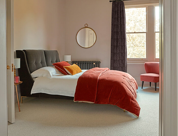 We’ve totally fallen for this warm and welcoming colour palette full of soft, sumptuous luxury. Our stunning Floyd bed, upholstered in gorgeously deep Carbon Matt Velvet, makes the perfect home for warming Spice and Ochre tones. Luxury bedroom accessories such as our Velvet Spice Throw and Ochre Cushion add warmth, coordinate beautifully, and are echoed in our Greta Chair, upholstered in Brick Plush Velvet. Hints of metallic gold from our Turin Bedside Table both complement and add texture.
