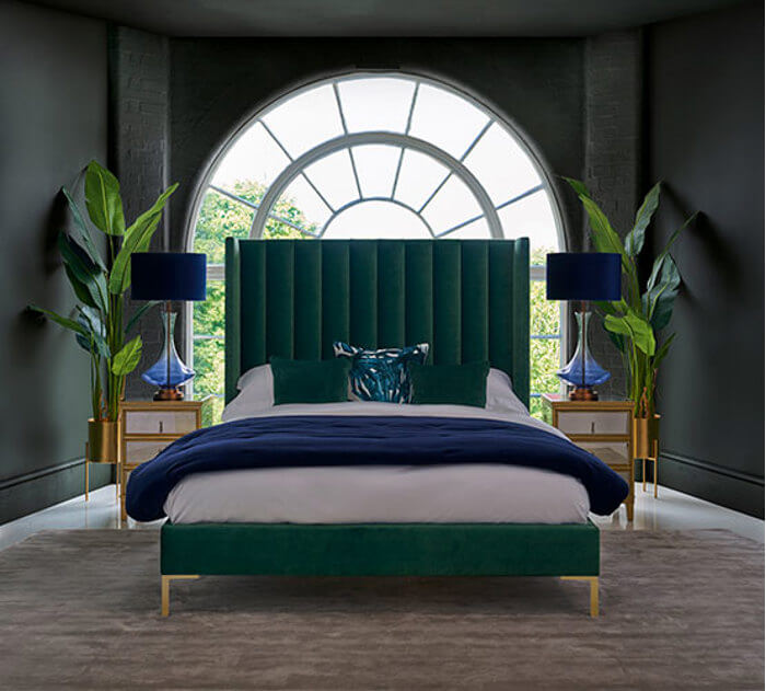 Driven by a strong emerald colour with elements of satin gold to elevate it makes this divine look even more exquisite. Our new Arlo Bed has been exclusively designed to have presence with a beautifully tall fluted headboard. The jewel tones that dominate this look are complemented by green and blue luxury bedroom accessories, and living plants where green is meaningful of life, nature and renewal.