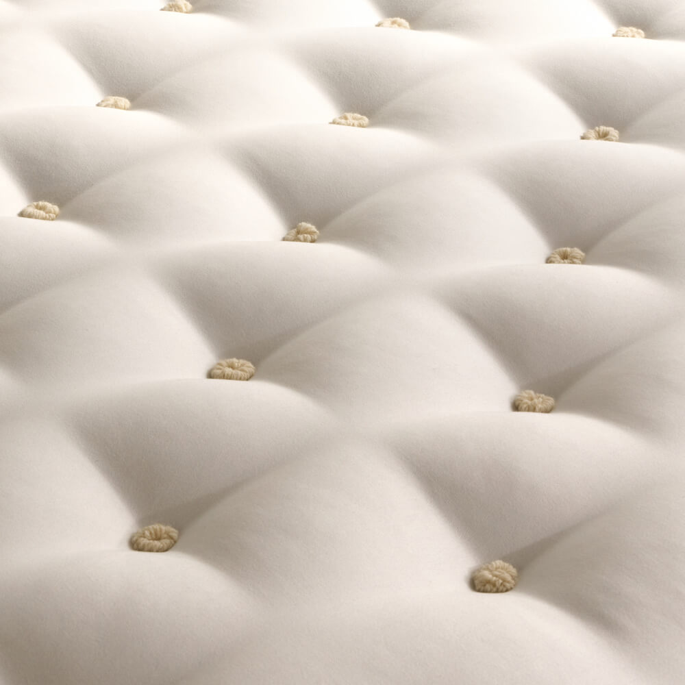 Around the springs, you’ll find generous layers of natural fillings. Carefully selected blends of British fleece wool, cotton, bamboo, cashmere, silk, alpaca, and layered Shetland wool work together to provide resilient, supportive comfort and excellent breathability, while maintaining the mattress’s shape over time.