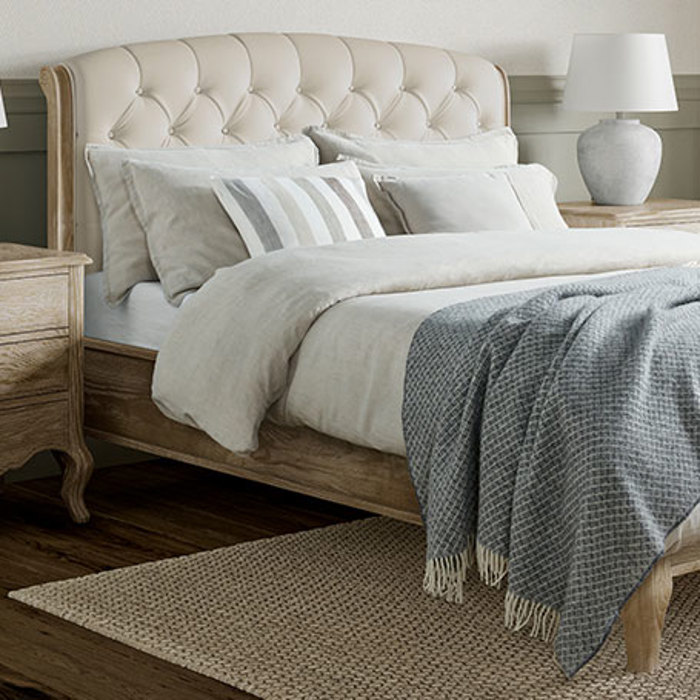 For French style sophistication you need to think sweeping curves, detailed carving and elegance; all of which are qualities you’ll find in our beautiful Salcombe Bed. But her statement making style doesn’t stop there… the linen upholstery, diamond button detail, the soft arches and scrolls all add to a stunning headboard style framed in weathered oak.