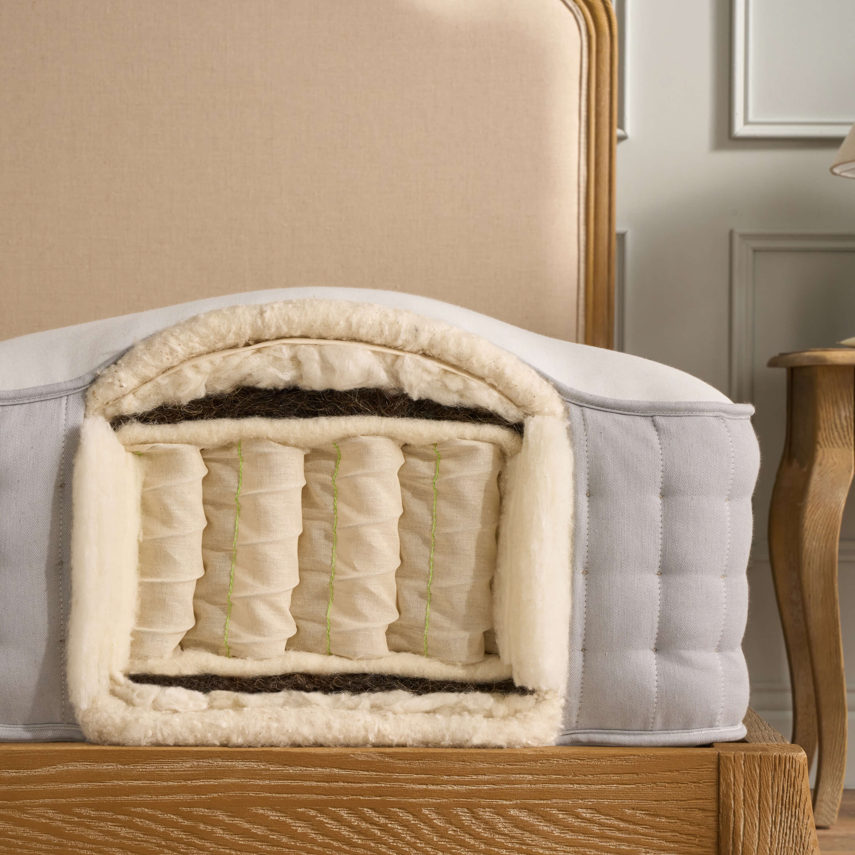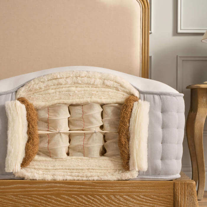 Wool, silk, bamboo, horsetail, cotton and cashmere have been carefully selected for their softness, breathability, and resilience. Each material is hand-laid over the springs to create a sleep surface that’s naturally insulating and hypoallergenic.